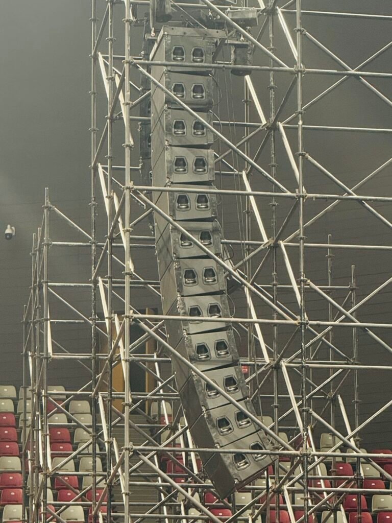 From a system engineering perspective, this project focused on line array speaker deployment rather than maximum output alone. The objective was to achieve consistent coverage across the audience area while maintaining intelligibility for fast-paced vocals and rhythm-heavy music in a reflective indoor environment.
